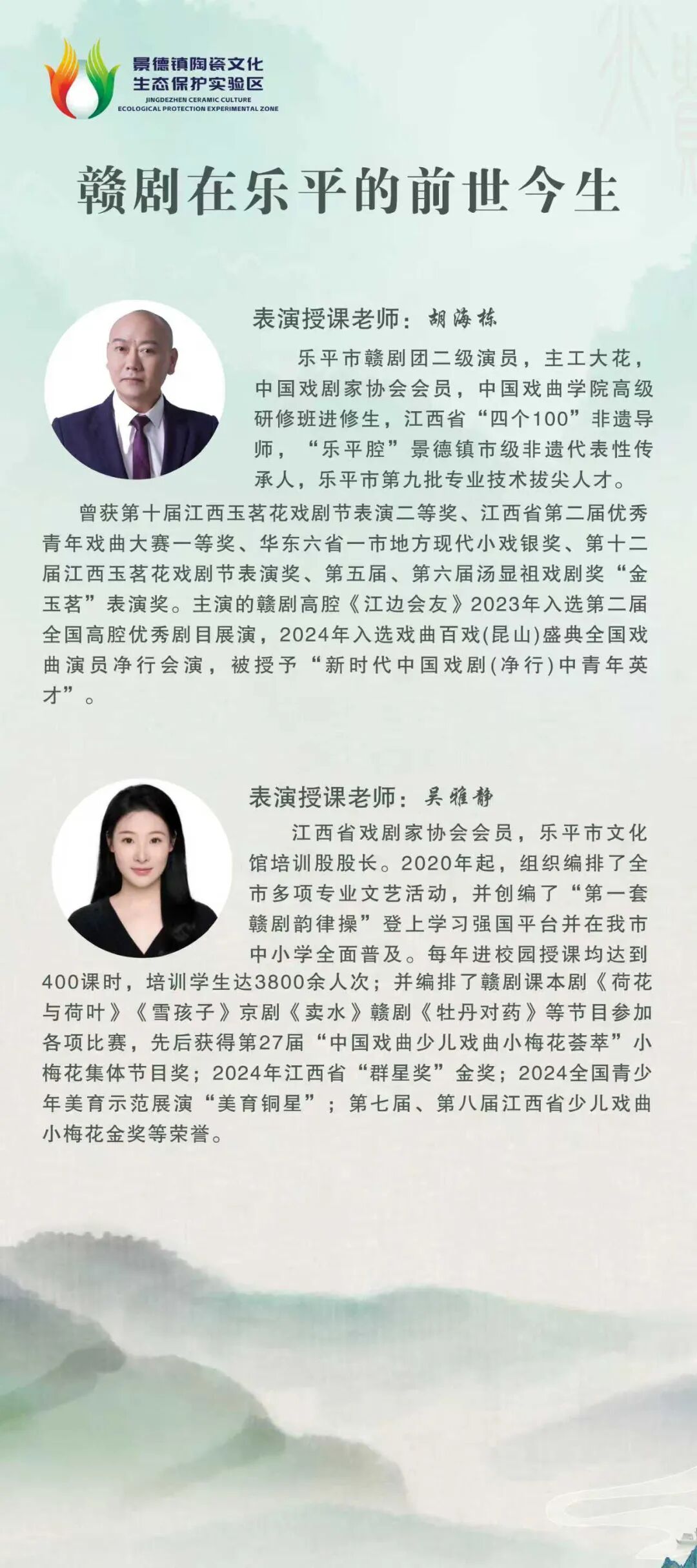 吴雅静 江西省戏剧家协会会员,乐平市文化馆培训股股长。2020年起,组织编排了全市多项专业文艺活动,并创编了“第一套赣剧韵律操”登上学习强国平台,并在我市中小学全面普及。每年进校园授课均达到400课时,培训学生达3800余人次。